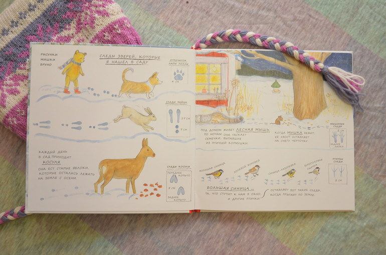 Дальше Бруна и Лола отправляются смотреть звезды, а для нас эти понятия пока абстрактны и после первого просмотра книги до самого конца, мы стали останавливаться здесь. Зато до этого все понятно, все знакомо. Ведь мы делаем все или почти все из этого: и кормим птиц на улице, и лепим снеговиков, и даже как-то попали в осеннюю метель.