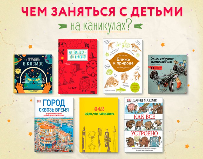 Что такое идеальные каникулы? Это море веселья, увлекательные игры, чудесные открытия и удивительные приключения. И все это вы найдете под обложками наших книг - познавательных, вдохновляющих и очень красочных. Ребенок не только узнает из них много нового, но и сможет применить свои знания на практике. Мы подготовили для вас по одному изданию на каждый день недели и кучу любопытных идей, как провести выходные с пользой.