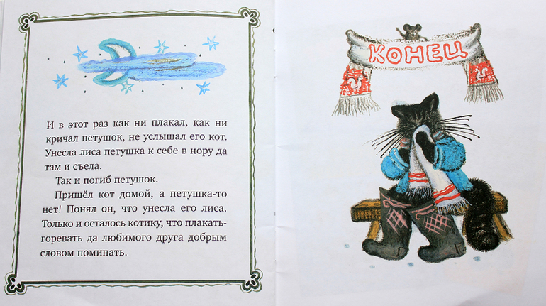 Не скажу что сказка стала любимой, но иногда ее читаем. Конец сказки я видоизменяю, так как дочка уж очень сильно за петушка переживает. Книжку безусловно будем читать еще не один год, находя в ней все новый и новый смысл.