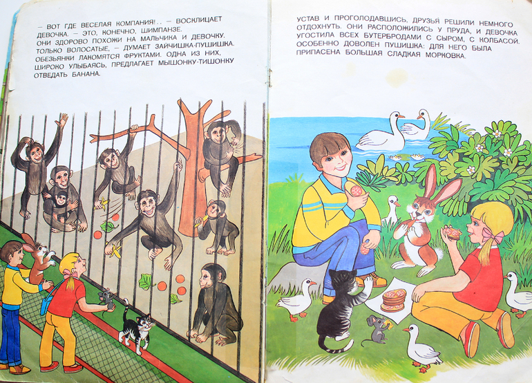 Сама история очень простая как зайчик, котенок и мышонок встретили у входа в зоопарк мальчика и девочку и пошли вместе с ними на экскурсию. Но я точно помню что какими-то волшебными мне казались эти мальчик и девочка.