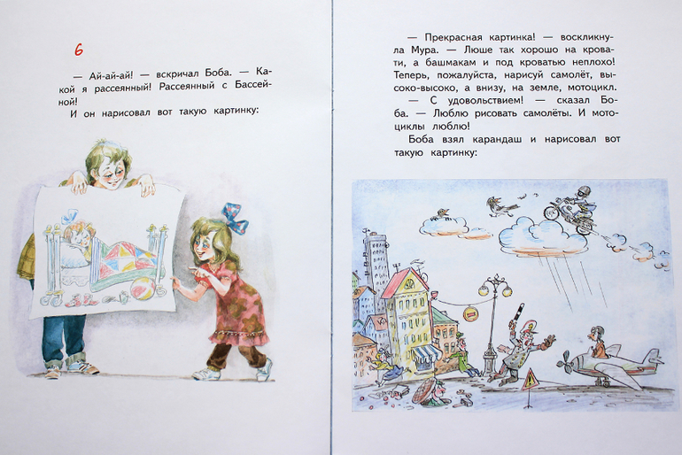 Идея книжки проста - Мурочка просит нарисовать Боба картинку, а он все время что-нибудь да путает. То мышку нарисует больше кошки, то девочку под кровать положит спать. А Мурочке все время приходится поправлять этого невыносимого Боба. А уж как нам полюбилось слово "чепуха" из этой книжки, дочка потом еще недели две пыталась все время его применять в своей речи и очень радовалась когда ей это удавалось.