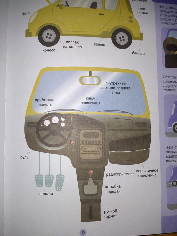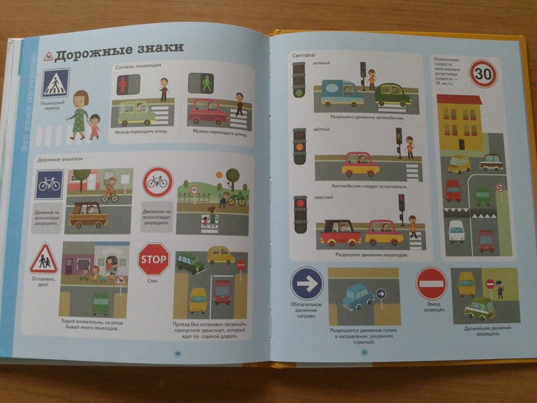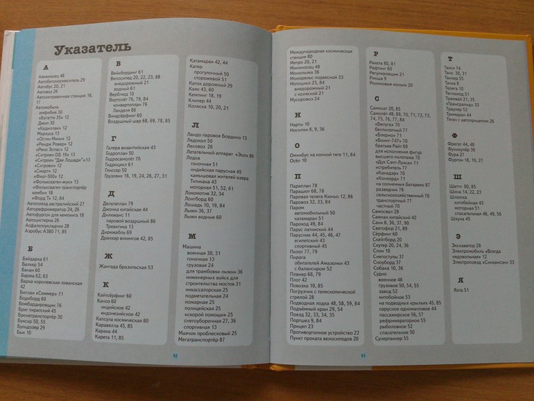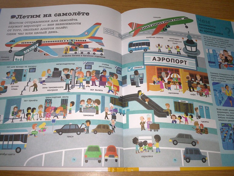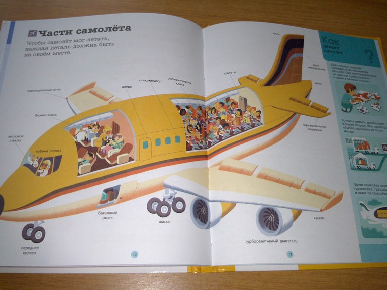 В книге 4 раздела.Три посвящены разным видам транспорта:на земле,на воде,в воздухе.В них рассказано о том,как устроен тот или иной вид транспорта,что происходит на ж/д вокзале или в аэропорту.В конце каждого из этих разделов есть развороты "Ну-ка вспомним,что узнали..." с вопросами по разным темам.В четвёртом разделе,который называется "Это тоже интересно",дана информация о истории транспорта,невероятных изобретениях,о дорожных знаках.