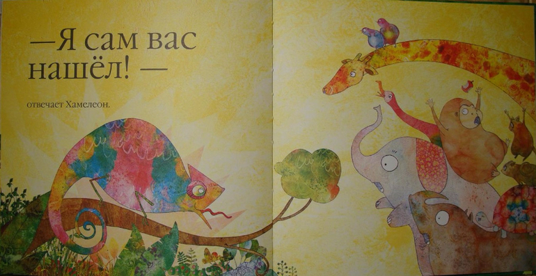 И вот игра на внимательность замечательна! На каждом развороте прячется маленький хамелеончик, найти которого не так уж просто.
