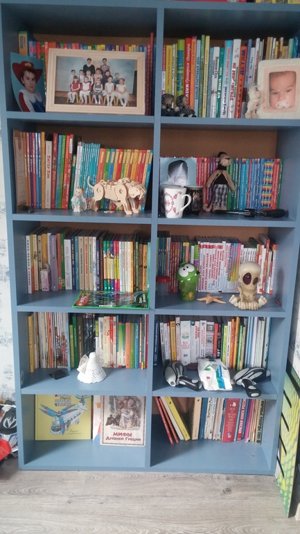 У нас нет как такового книжного шкафа, мои книги у родителей пока, Санькины помещаются на полочках "стенки" в зале. 6 очень коротких боковых полок, на которых стоя стоят книги "на сейчас", а книги на вырост (лет до 3) просто стопками. Представьте мою растерянность, когда одна знакомая оглядела полки и спросила: "это что, ВСЁ детские книги?". Я только и смогла выдавить: "да". Вроде бы обложки всех цветов радуги предполагали, что я там не русскую классику храню. На мой взгляд, там совсем мало стояло. Я уж не стала рассказывать, что кое-что у меня по далёким шкафам припрятано, чтобы какой-нибудь Андерсен не пылился, а мои книги по большей части у родителей, потому что пока нужды нет их переносить.
