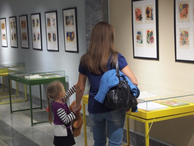 И уйти бы нам без автографа, если бы не одна чудесная женщина, которая сначала повела Олесю за пряником, а потом, услышав, что она хотела подписать книжку, взяла ее за руку и отвела к художнику. Не знаю, кто она, но явно работник библиотеки, и, наверное, имеет прямое отношение к выставке, или просто давно знает Чижикова, судя по тому, как она запросто и уверенно подошла и попросила Виктора Александровича "уделить несколько минут нашим маленьким читателям".