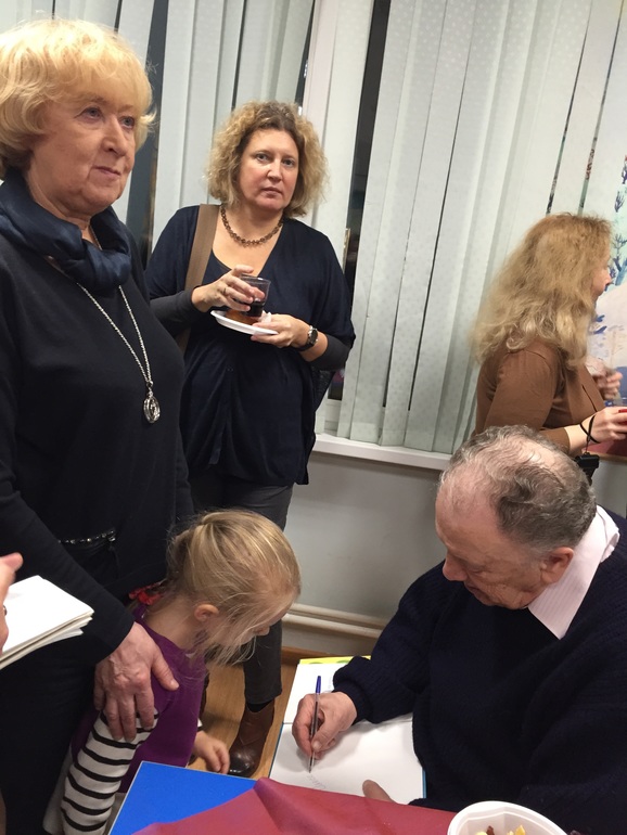 После торжественной части Виктор Александрович отошел передохнуть, и, конечно, тут же выстроилась небольшая очередь с цветами и книжками на подпись. Олеся вертелась тоже в первых рядах со своим любимым "Айболитом", но тут подошла (видимо) одна из организаторов и увела художника на банкет.