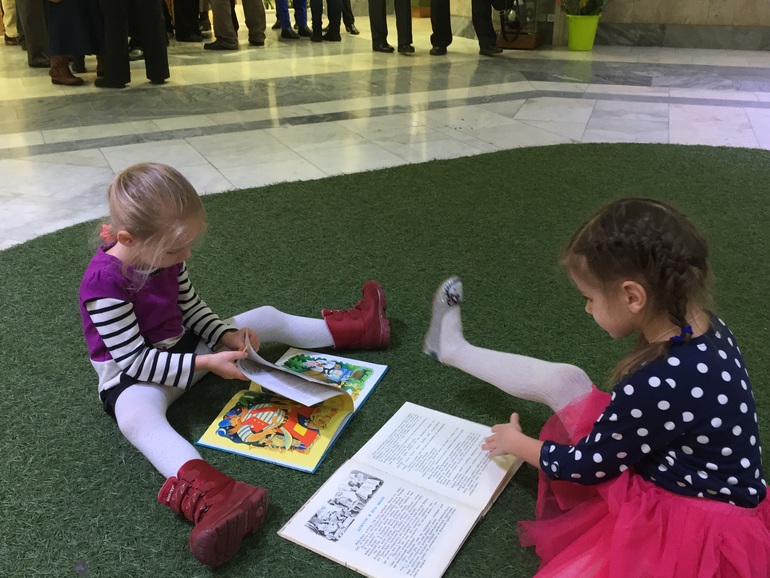 А Олеся и еще одна девочка по имени Соня уселись прямо посреди зала сравнивать своих "Айболитов". У девочки был какого-то лохматого года выпуска (1967?), а у нас - современное переиздание этой книги, - рисунки полностью совпадали :)
