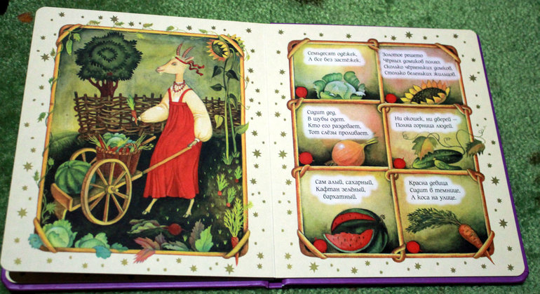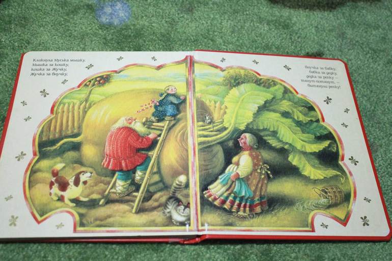 Итак, как-то я обещала показать наши картонки с потешками. Однажды возле дома закрывался книжный магазин, но, как назло, бюджета было мало и мне попалась в руки изумительно-психоделическая по цветам книжка "Репка". Этой классики народных сказок у тогда еще полугодовалого бутуза и в помине не было, а мне прямо срочно было очень надо ну хоть что-нибудь купить на этом аттракционе неслыханной щедрости, стоила-то книжка всего 100 рэ. К виньеткам и позолоте я всегда была равнодушна, но плотный картон, пухлая обложка и яростный психодел в картинках, подвергавших в ужас бабушек и прабабушек бутуза буквально заставил меня скупить всю серию позже (не из вредности, нет).