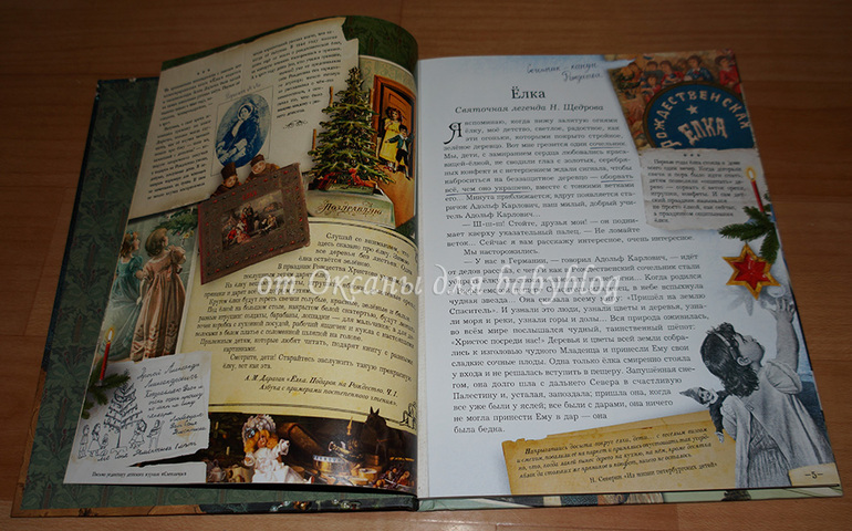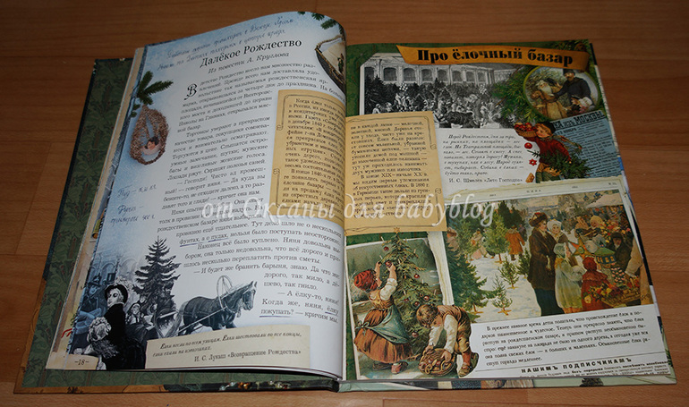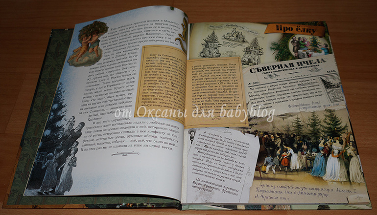 Самый первый разворот, вполне типичный для этой книги. Много текста, иллюстраций, текстовых вставок. Все это оформлено со вкусом, очень празднично и ярко.