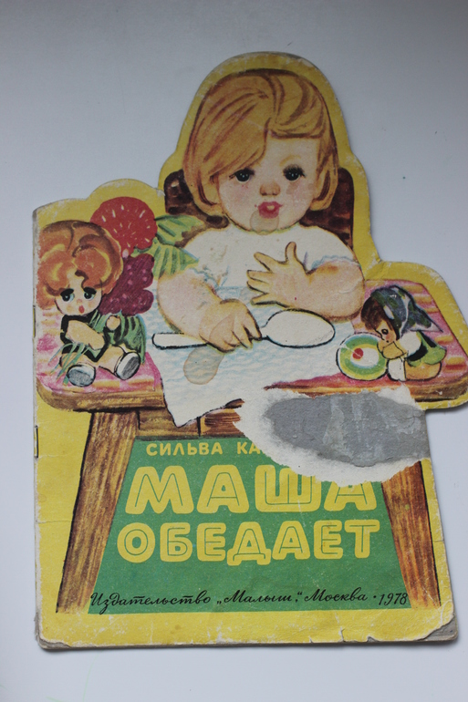 Вторая книжечка про девочку Машу и про обед (Миша у нас любит покушать и послушать как кто-то что-то ест)) На обложке отсутствует кусочек- недосмотрели за старшим.
