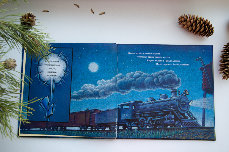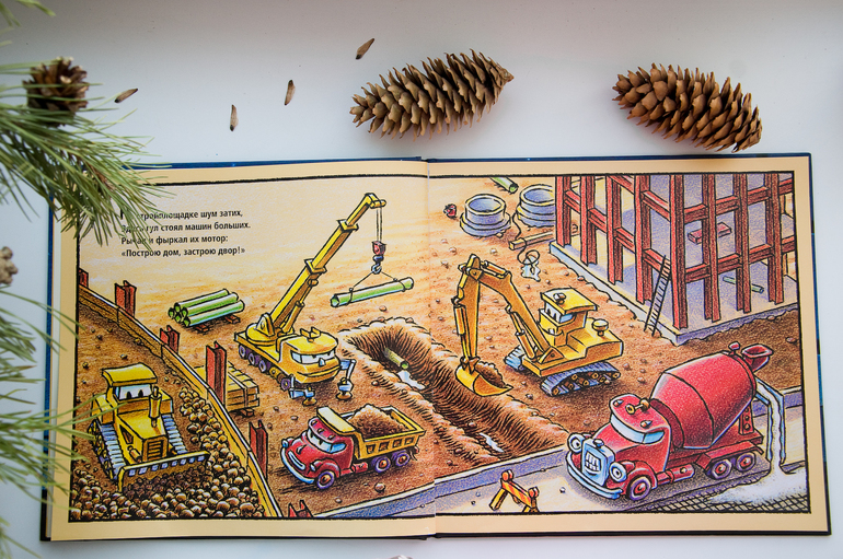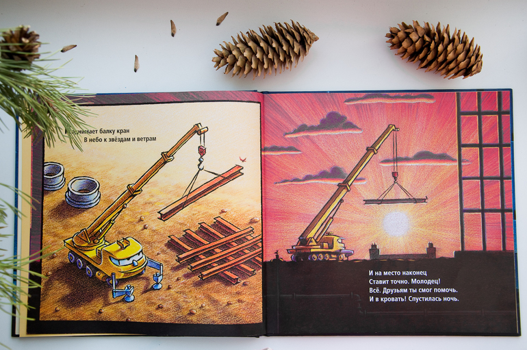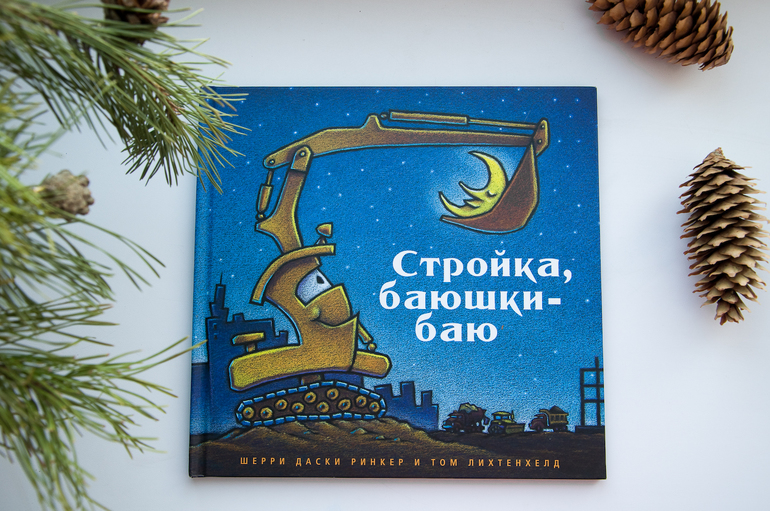 Одни из самых любимых в нашей библиотеке со дня появления остаются Ринкер Даски «Стройка, баюшки-баю» и «Чудный поезд мчится в сон» (Карьера-пресс, 2015г.). Первой покупала про поезд, стройку вначале отвергла, а зря. Она бессменный хит у нашего ребенка, впрочем, как и у многих. Чудесные успокаивающие иллюстрации, большой формат, милое стихотворение и, конечно же, техника! Много техники! Если хотите привлечь мальчика к книге, то эти две самый лучший вариант. А текст прилипчивый до жути, цитируем постоянно: