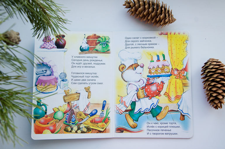 Есть у нас и пара книжек-картонок со стихами, тоже усиленно читались и читаются по сей день. Наталья Мигунова «День рождения Мишутки» (Алтей, 2013г.). Милое стихотворенье о празднике у медвежонка, особенно много читали в прошлом году перед Днем рождения друга. Хорошие картинки, картонные страницы.