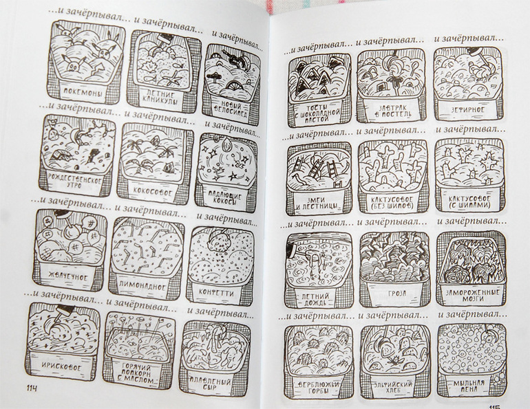 Есть пример, где герою накладывают мороженое, на страницах появляются разные сорта: клубничное, апельсиновое.. и так много страниц.. демонстрируя безграничную фантазию в сортах - на шестой странице уже пошли сорта мороженого черные дыры и кирпичные дороги