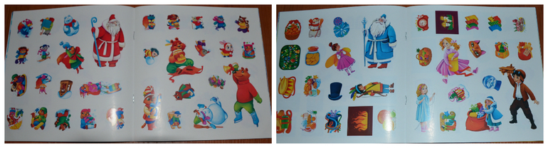 В каждом альбоме по 2 разворота с наклейками. Наклейки бумажные и, скорее всего, одноразовые. Как отделяются от подложки - не могу сказать. Надеюсь, что без особых проблем, потому что я планирую оставлять Андрея наедине с ними )))) Эти книги - тот самый случай, когда ребенок не ограничен никакими правилами наклеивания, нет заданий и прочих условностей. Куда захотел - туда и прилепил)))