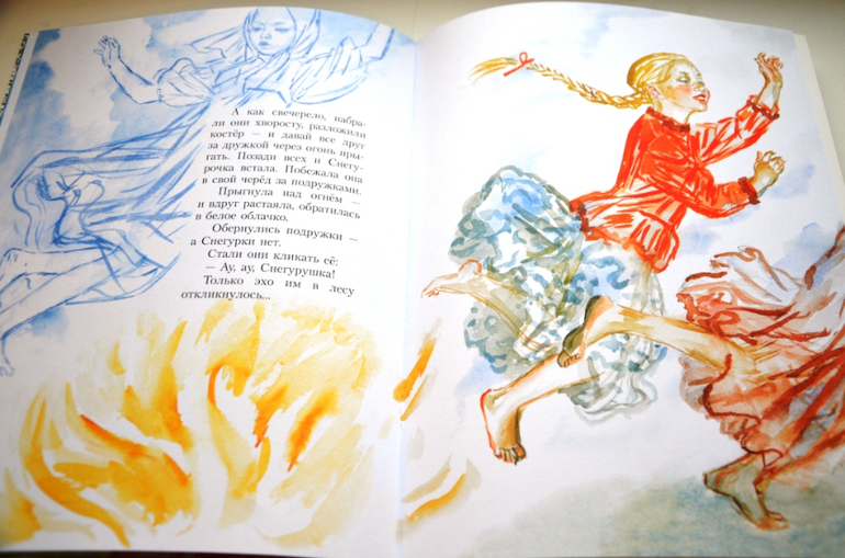 Далее "Снегурочка", здесь уже моя потеплела и стала активнее: "смотри какие дедушка и бабушка; ого живая стала; растаяла! как!?" Иллюстрации Алексея Пахомова прекрасны, умеет он так чутко изображать лица людей, особенно старшего поколения (очень люблю его "Бабушку, внучку и курочку"), сюжет ребёнка явно заинтересовал, включим в наш книжный рацион обязательно.