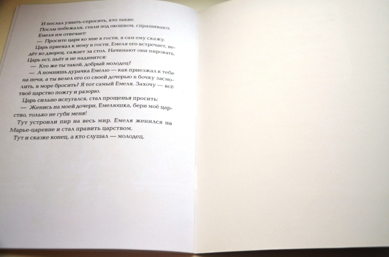 И напоследок оставили самую длинную "По щучьему велению" надеялась уболтается, уснёт, но не тут-то было, слушала с интересом - очень обеспокоилась судьбой пойманной щуки: "мама, куда рыба делась? где она?", осталась в недоумении от вёдер-самоходов и саней ("сами, как сами? ого, волшебные!"), не думаю, что поняла весь смысл сказки, но с сюжетом познакомилась. А в конце огорошила: "почему он дурак, Емеля?"