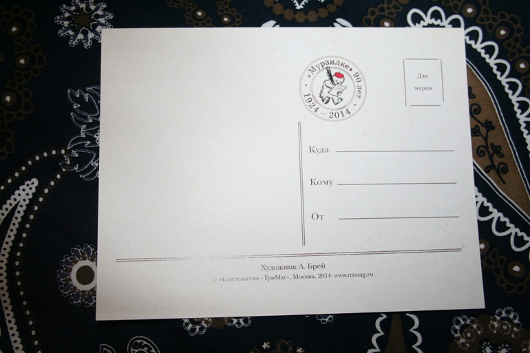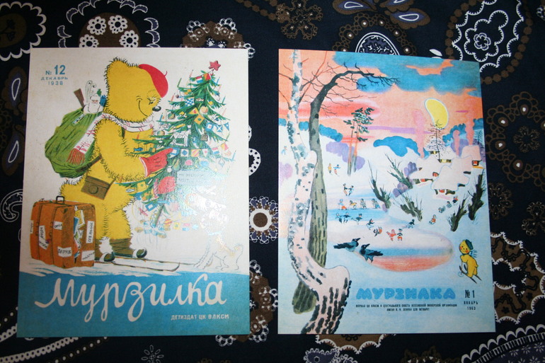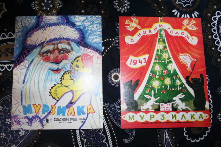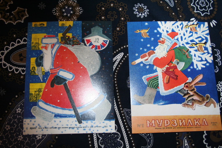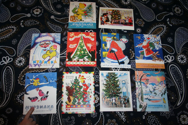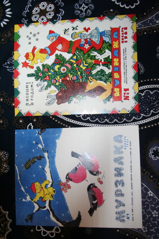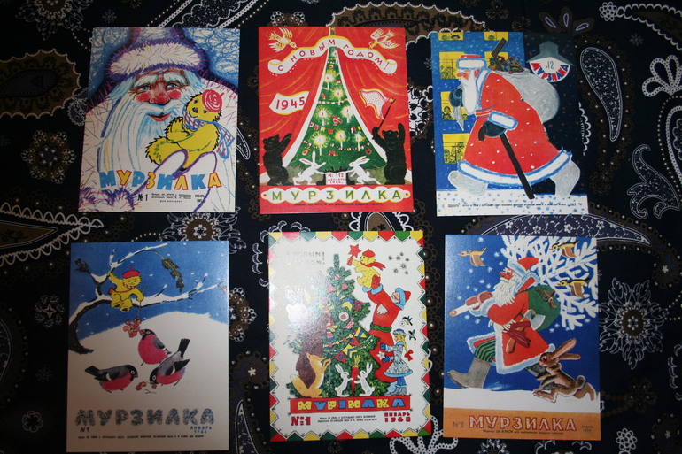 Мурзилка в открытках, на выставке продавались по 10 рэ. Мне дали бесплатно за покупку. Пока не нашла им применение, мне больше всего понравилась открытка с портретом мороза, кна руках которого желтый мурзилка и с березой (розово - синее небо) самая нижняя справа.
