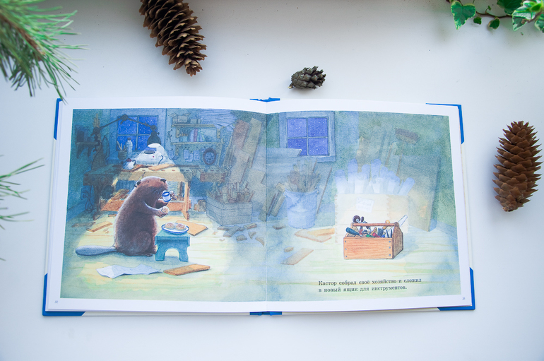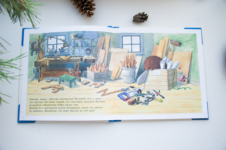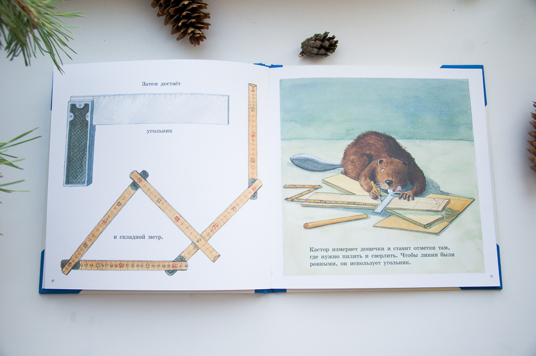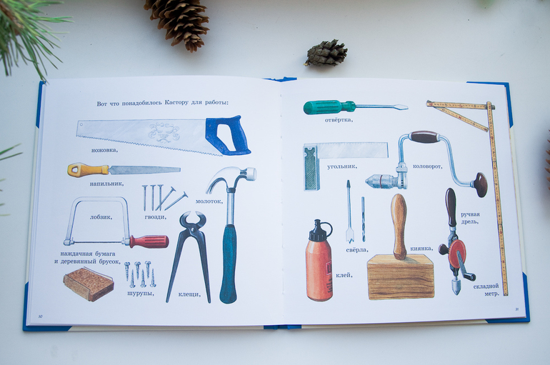 Сын безумно любит возиться с инструментами, болтами и гайками, так что с выбором я не прогадала. С этой книгой в обнимку мы не засыпаем, да и по 15 раз в день не читаем. Однако, интерес есть. Текст простой до безумия. Кастор пошел туда-то, взял то-то, сделал то-то, иллюстрации приятные глазу, плотная офсетная бумага. Все инструменты нарисованы крупно и очень реалистично, в конце книги дан даже чертеж, по которому мастерил рукастый бобер.
