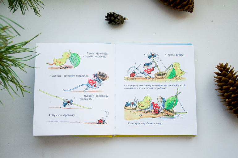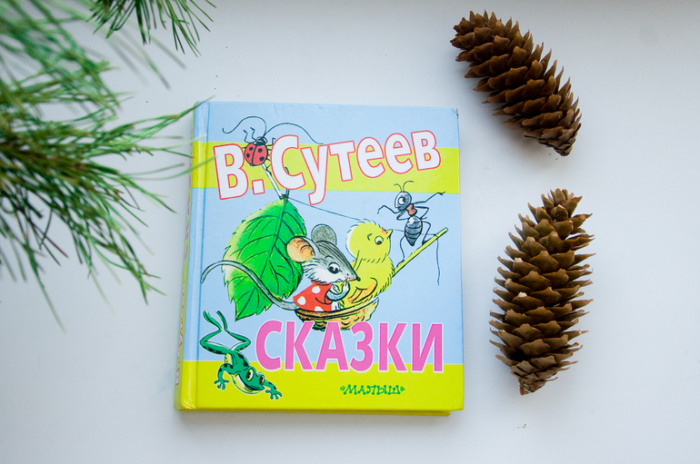 Сказки В.Сутеева (АСТ, 2013) тоже обязательное явление в любой семье, где растет маленький ребенок. У нас книжка небольшого формата, простенькая, зато удобная, без труда помещается везде. Была с нами и в самолете, и на пляже. Все бока покусаны от горячей любви. Не советовала бы брать большеформатные и толстые издания с Сутеевым. «Кирпич» малышам сложно читать, сами взять книгу они не могут, да и однообразность рисунков скоро надоедает.