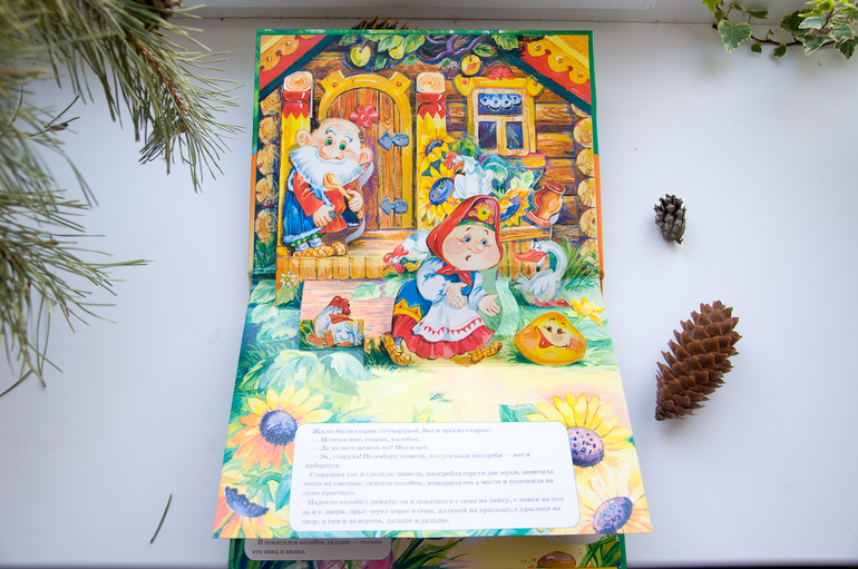 Как и в прошлый раз, начнем от простого к сложному. Не открою, наверно, никакой тайны, когда предположу, что первая книга в прозе у большинства детей - это самые простые русские сказки. У кого в доме нет «Репки», «Семерых козлят» и «Курочки Рябы»? У нас тоже есть, но показывать не буду, так как это страшнючие картонки Проф-Пресса. А вот «Колобок» (Олма Медиа Групп, 2014) мне нравится, его и покажу. Люблю я такие панорамные книги, большое их количество, конечно, утомляет, а вот одну-две иметь стоит. Многие ругают эту книгу за аляповатость, а мне она кажется праздничной, нарядной.