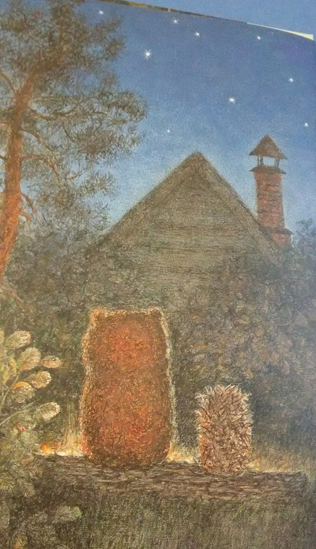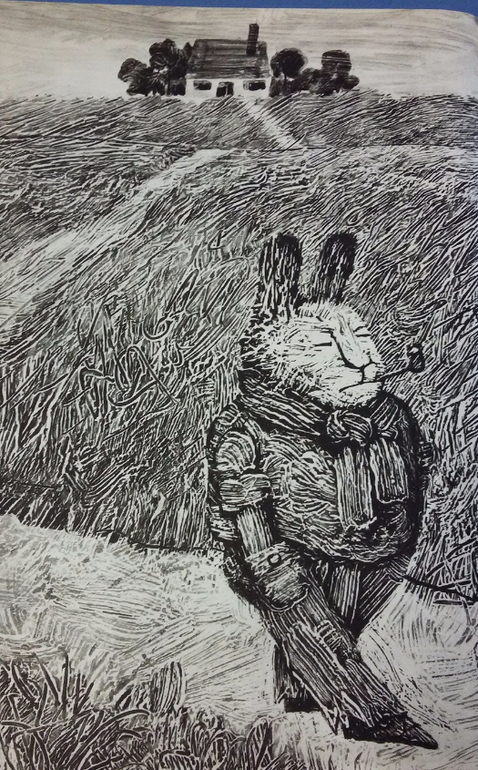 Крыша брутального братца Кролика не менее брутальна, чем он сам. Она возвышается над бескрайним полем. Талант художника Калиновского в том, что даже эта черно-белая гравюрная иллюстрация полностью поглощает мое воображение, и я будто слышу как ветер колышет сухие травинки.