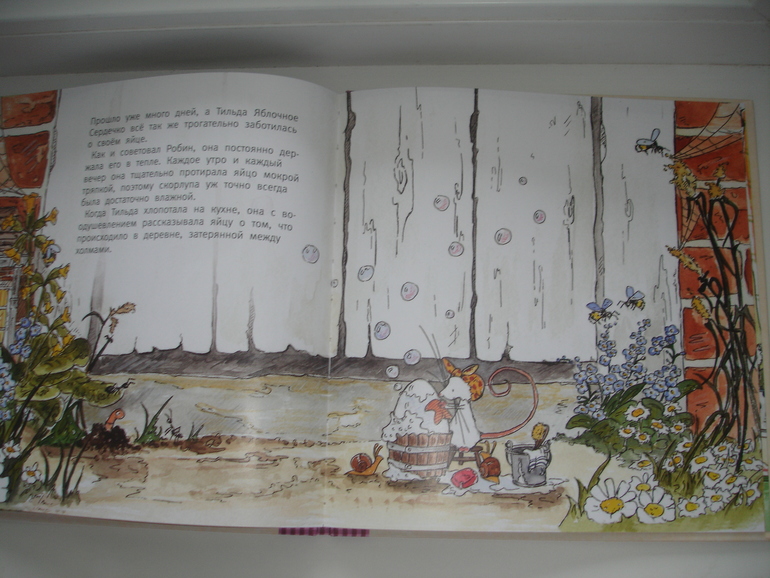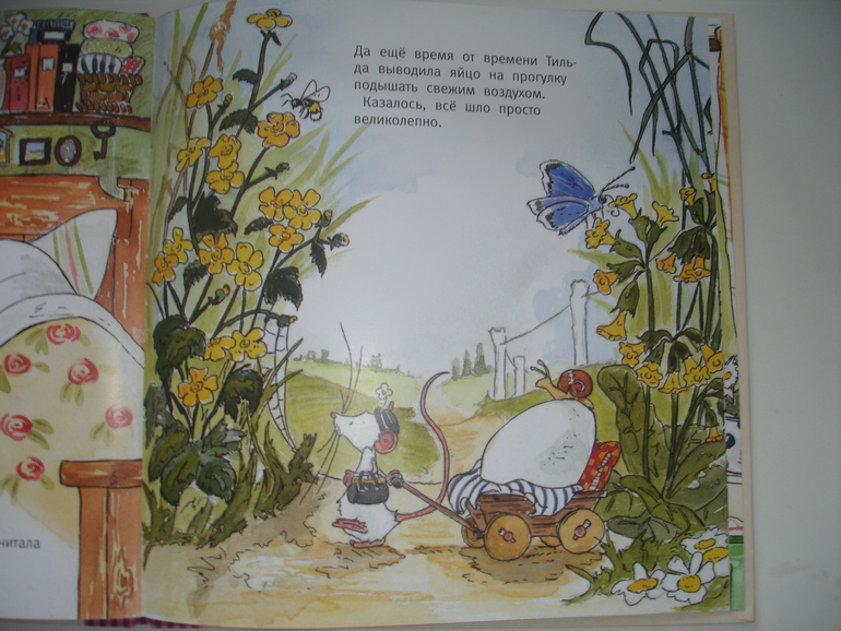 ....Тильда принимает решение самой ухаживать за яйцом, пока не объявится хозяин. Она увлажняет его, читает ему на ночь и даже выводит на прогулку (тут к сумочке прибавляется шляпка истинной леди).