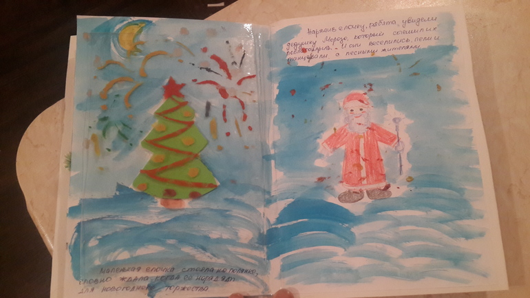 Ну а затем находят елку - наряжают ее (повернув прозрачную страницу). И появляется дед мороз. Всеобщее бесение с хороводами и занавес.