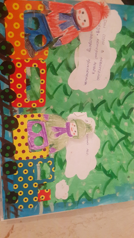 В общем там белка в дупле, заяц под кустом, медведь в берлоге. А в мешке морковка, мед и орехи, а также два леденца мальчишкам. Звери так же выходят из домиков и переходят на следующую страницу.