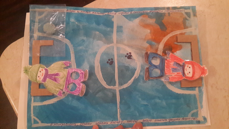 В общем живут два братца (вставляешь пальцы в прорези и ходишь). И както получили письмо от деда мороза, в котором он попросил помощь - раздать подарки зверям, поиграть с ними и отпраздновать праздник.