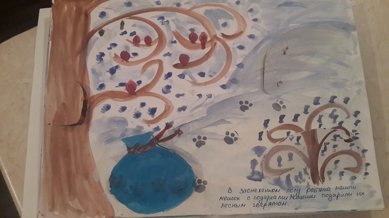 Вот тут (в лесу) хлопцы находят мешок - а в мешке подарки и нужно найти зверят, которым все эти богатства подарить (кого по следам, а кого из знаний кто где живет, а можно просто вскрыв все окошки: