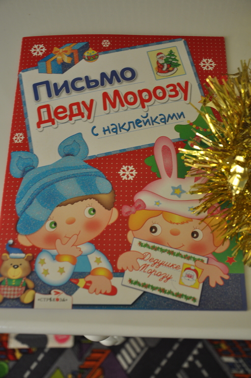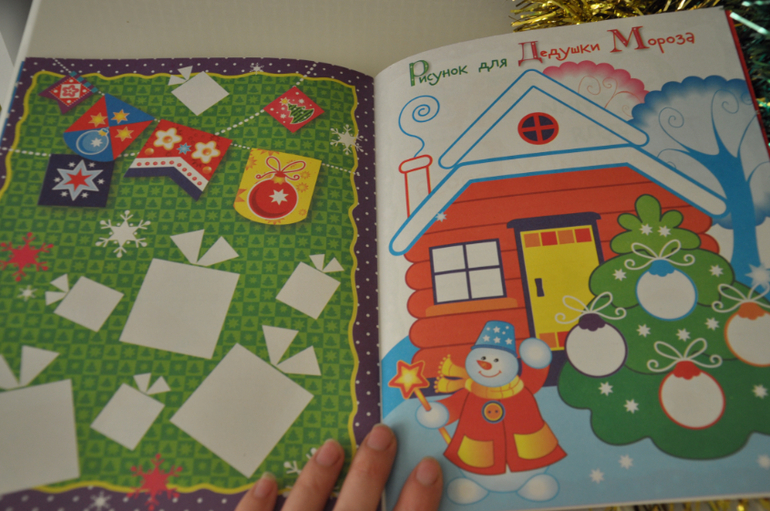 Достаточно много вариаций таких книжек, тут и бланк письма, и рисунки , которые надо раскрасить и отпраить Деду,и рассказ о Новом годе в других странах, тут еще есть разворот наклеек. 12 страниц, оффсет.