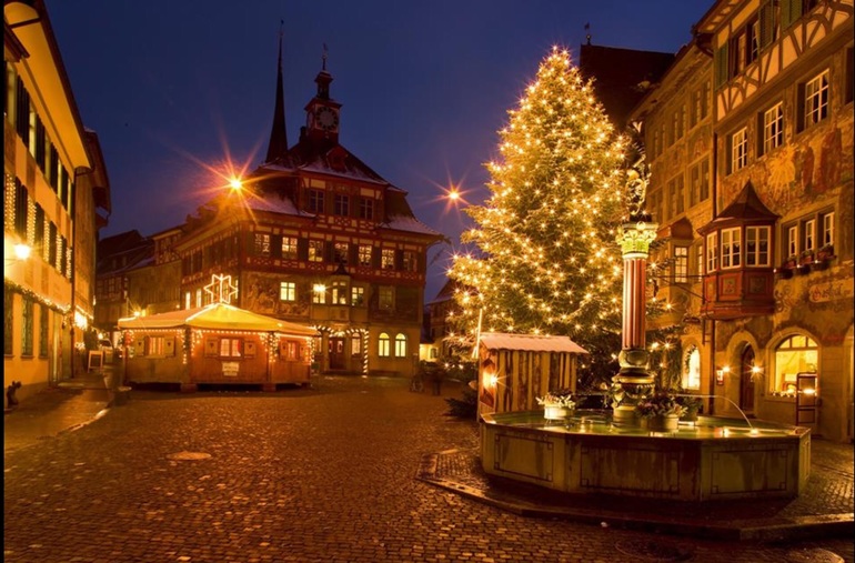 В городах устанавливаю елки, украшают место проведения ярмарки гирляндами, продают Glühwein - глинтвейн ( кстати сказать, только здесь я впервые попробовала глинтвейн из белого вина. Он мне нравится больше)) и Guetzli - рождественское печенье.
