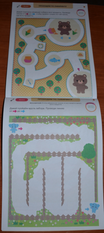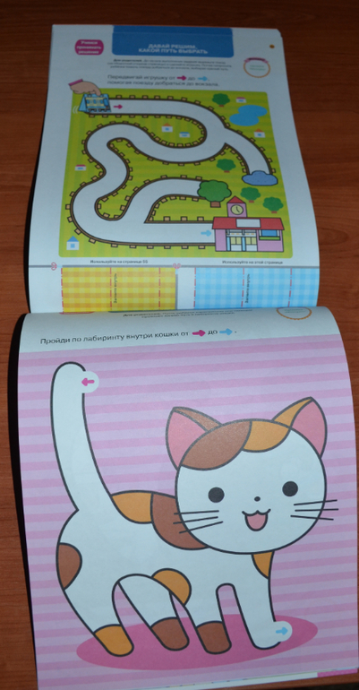 "Лабиринты 2+" - эту тетрадь сравнить можно скорее с "Простыми линиями" KUMON, нежели с Лабиринтами. Сложность нарастает ооооочень постепенно, что лично меня, оооочень устраивает :) Задания разные, интересные. Также предполагается использование поощрительных наклеек на каждом листе и немного наклеек в самих заданиях.