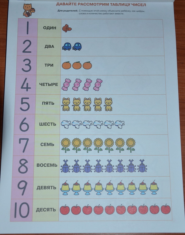 В самом начале предложена таблица соотнесения цифр, слов и количества предметов. На мой взгляд, весьма удачная.