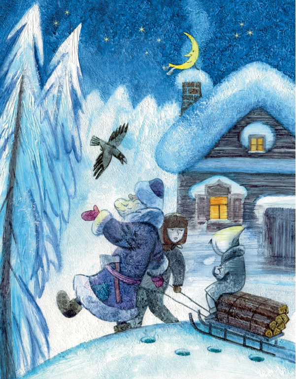 В сказке должны быть не только положительные герои. Считаю, что у меня лучше получаются герои отрицательные. Сразу возник образ господина Ледяного ветра, это была первая полосная иллюстрация, которую я сделала. Дедушка Морозко, как ни странно, тоже поначалу предстаёт в книге как прислужник Ледяного ветра. Но я его быстро раскусила: в нём сочетаются ворчливость и доброта:)
