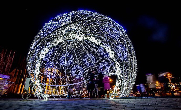 В этом году, как и в прошлом, новогоднее настроение посетителям Октябрьской площади создают еще и ажурные большие елочные шары, расположенные по краям площади и … 65 километров электрических гирлянд!