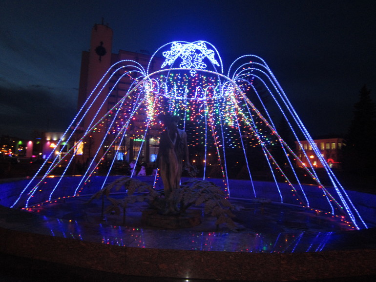 Эта самая большая елка Республики, которая достигает 33 метра в высоту. И вечером выглядит вот так: