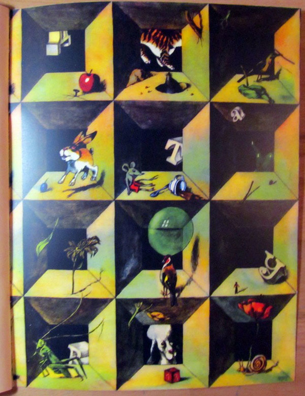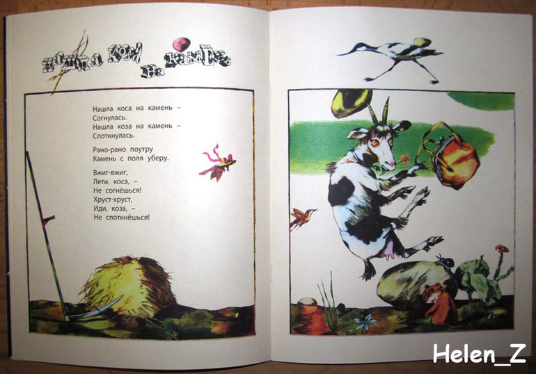 Интересно пространственное расположение персонажей. Все они находятся в движении, даже когда стоят одной ногой на спинке стула, Ослик у Шурица, конечно же, перевернется вниз головой, обезьяна поедет на велосипеде, коза вообще изображена в полете. На странице много персонажей, предметов, но картинка при этом гармоничная, живая! Разглядывай, фантазируй!