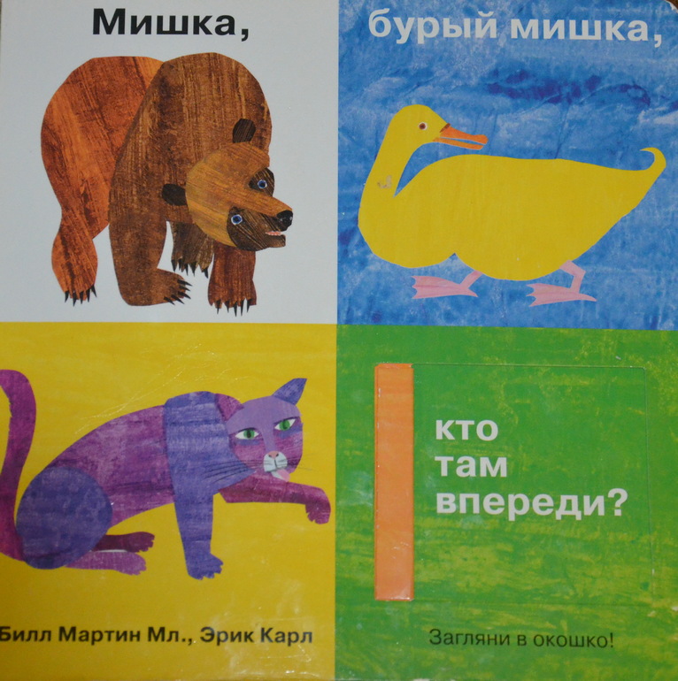 Особенно же меня впечатлила книга «Мишка, бурый мишка, кто там впереди?» Эрика Карла, автора знаменитой «Голодной гусеницы». Я с ног сбилась, разыскивая ее в интернете. Эту книгу любят все, кто работает с маленькими детьми. Она прямое доказательство, что все гениальное - просто. Простые изображения животных, выполненные в наивной манере, и словно вырезанные непослушными ножницами, идея предвосхищения того, кто изображен на следующей странице. Оригинально открывающиеся окошки - навык, который малышу предстоит освоить. Эффект неожиданности при встрече с детьми, изображенными на последней странице. Всего этого достаточно, чтобы книга надолго оставалась в разряде любимых. В возрасте около года - это был настоящий хит!