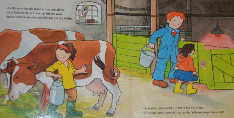 Она вполне себе традиционная в этой категории, хороша тем, что у нее страницы из плотного картона, не рвутся, не мнутся после многократного использования. И сюжеты понятны сами по себе, даже без текста (я немецким не владею). Малышу нравится узнавать на картинках животных, машины. Темы: ферма и зоопарк. Возвращаемся к ней часто. Потом будем придумывать по картинкам рассказы, отсутствие текста к этому стимулирует ))
