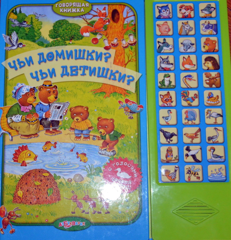 «Чьи домишки? Чьи детишки?» от Азбукварик. Эта книга очень понравилась ребенку в кабинете у врача. Голоса животных там самые настоящие! Настолько реалистичные, что ребенок даже боялся некоторое время к ней подходить, потому что медведь рычит ну очень грозно! По картинкам можно усвоить, кто где живет, выучить, названия семейств животных. Картинки наоборот очень детские. Словом, книгу можно изучать долго.