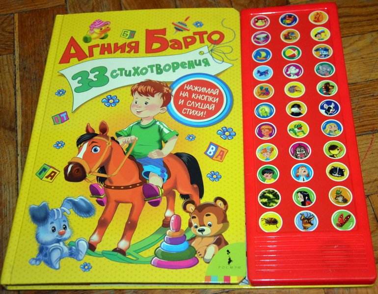 Купила ее по рекомендации. Сейчас уже понимаю, что это не самый удачный вариант. Судите сами. На развороте сразу 4 стихотворения. Не понятно, куда смотрит ребенок, когда ему читают стихотворение. Озвучка книги не плоха. Иногда спасает, когда нужно занять ребенка на некоторое время, а он требует чтения. Кнопки нажимаются легко, это важно! Я не в восторге, но ребеныш книжку оценил.