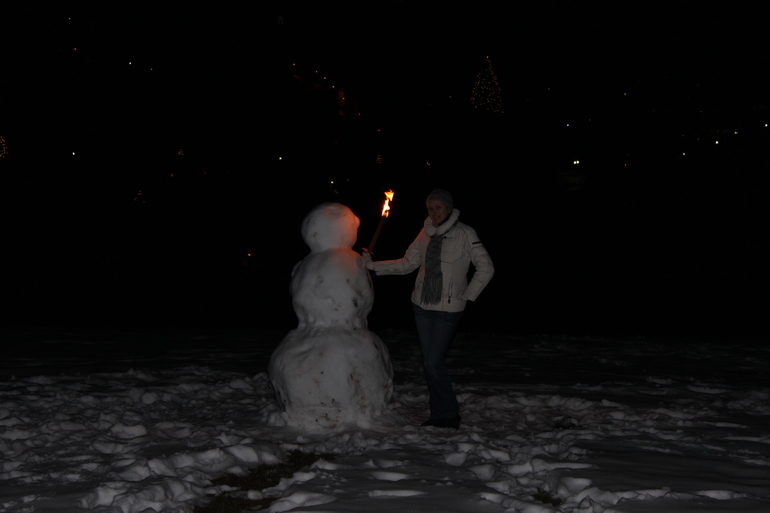 25-го декабря после обеда жители собираются в центре городка и вместе идут по лесной дорожке в гору. А какой вид открывается по дороге! Горы, лес, снег, маленькие домики городка, а на склоне среди снега яблоки на деревьях для птиц оставлены.