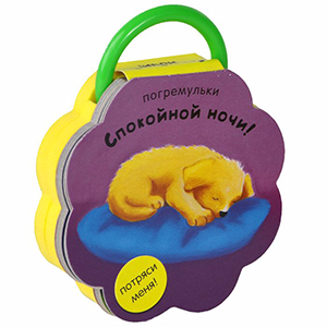 Еще одна погремушка от Мозаики-Синтез, очень похожа на две предыдущие, но с некоторыми отличиями. Во-первых, у нее самый удобный держатель из трех, маленькой ручке держать и трясти удобно. Во-вторых, погремушка не выступает наружу, спрятана в блок задней обложки. Но главное отличие - в содержании: нет никакой истории, на страничках нарисованы предметы, имеющие отношение к одной конкретной теме, в данном случае ко сну: кровать, подушка, одеяло, месяц, пижама... . Нам очень понравилась, для разнообразия приобрести стоит.