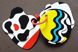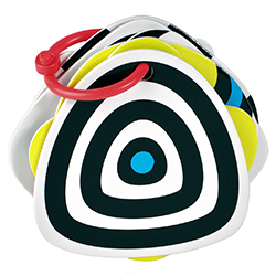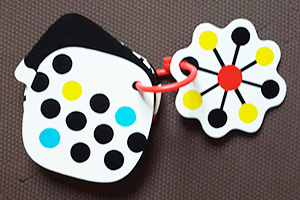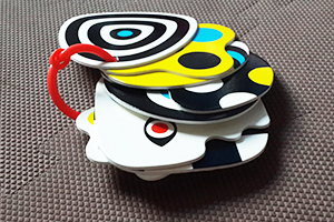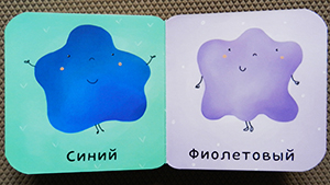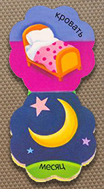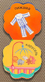 Отличная книжечка, которая на книгу, вообще говоря, мало похожа. Состоит из восьми очень плотных двухсторонних карточек разных форм на пластиковом колечке с застежкой, карточки можно снимать и надевать назад. Можно подвешивать над ребенком, можно развешивать вокруг, выкладывать перед ним или давать перебирать в ручки, если возраст позволяет.