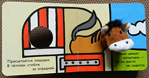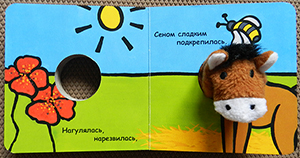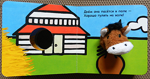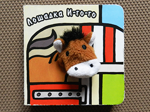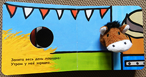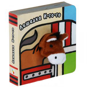 Книжка с пальчиковой куклой, она находится на последней страничке, но проходит через все странички сквозь отверстия - странички листаешь, а главный герой остается. Только ушки у лошадки слегка застревают иногда, но это мелочи. Качество - отменное, уж сколько она у нас пережила, толстые картонные странички оказались очень слюнеустойчивыми, матерчатая лошадка, кажется, намертво приделана к книжке.