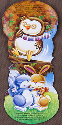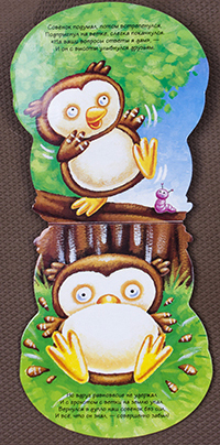 Содержание тоже довольно странное. Стихотворение про совенка, который все знал и остальные звери все у него спрашивали. Но вдруг совенок падает с ветки и забывает все, что знал. Что же будет с совенком? А ничего особенного. Уже на следующей странице он снова на ветке, только уже в шарфе, потому что наступила осень, щедро раздает всем советы. О том, как он все вспомнил и как вернулся на ветку - ни полслова.