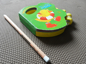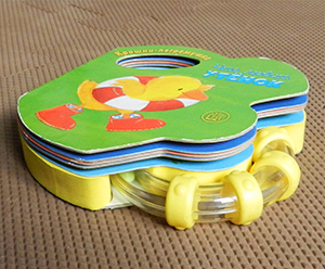 Картон среднего качества, довольно тонкий, слоится. Состоит из 8 страниц, задняя обложка толстая, из вспененного полимера, в ней находится погремушка, к которой никаких вопросов: внутри бегают шарики, звучит приятно, с разноцветными ободочками для использования в качестве прорезывателя. Но нам эта функция не пригодилась, кроме жирафика Софи сын почти ничего не брал грызть. Мне ручка сначала показалась бестолковой: маленький вырез для такой толщины книги. Но ребенок никаких неудобств не испытал, книжку тягал и тряс.