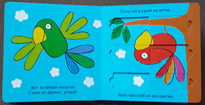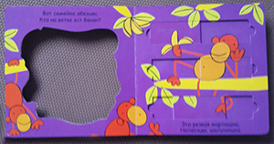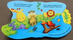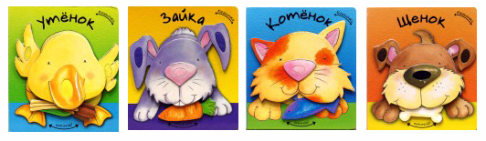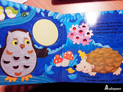 Книжка похожа на книги серии "Милашки-очаровашки" из пункта 15, обложка тоже с тактильной вставкой. Но в этой книге еще есть вырубки и подвижные элементы на страничках. Выдвигать окошко у моего сына раньше не получалось, а вот засовывать пальцы в дырки - это пожалуйста и с удовольствием. Сейчас, думаю, он бы и с окошком справился, но книжку у нас увели на игровой площадке в конце лета, новую покупать не стала. Хотя поглядываю на "Волшебный сад" из серии, черепаха на обложке уж больно заманчивая.