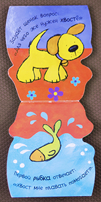 Иллюстрации средненькие, глаза-точки, куда без них, не очень содержательные: просто изображены животные, о которых говорится в стихотворении. Оно о щенке, который задался вопросом, для чего нужен хвост и узнавал, как его используют другие животные: рыбка, обезьяна, корова. Хотя, пожалуй, содержание и оформление как раз подходят для самых маленьких.